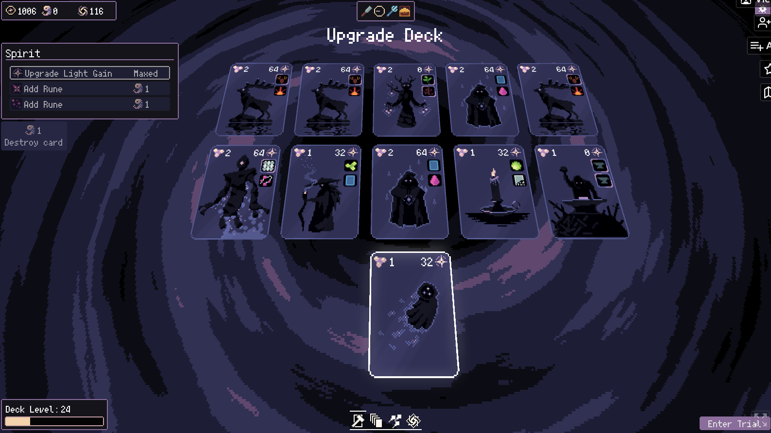 3. I'm kinda surprised that there isn't a blessing that does the standard incremental thing and automates card upgrades? I'd love a blessing that, say, made it so void tokens and embryos spent on one Spirit got spent on all of them, or one that made it so void tokens spent on runes also get spent on upgrading the card's base light gain.
